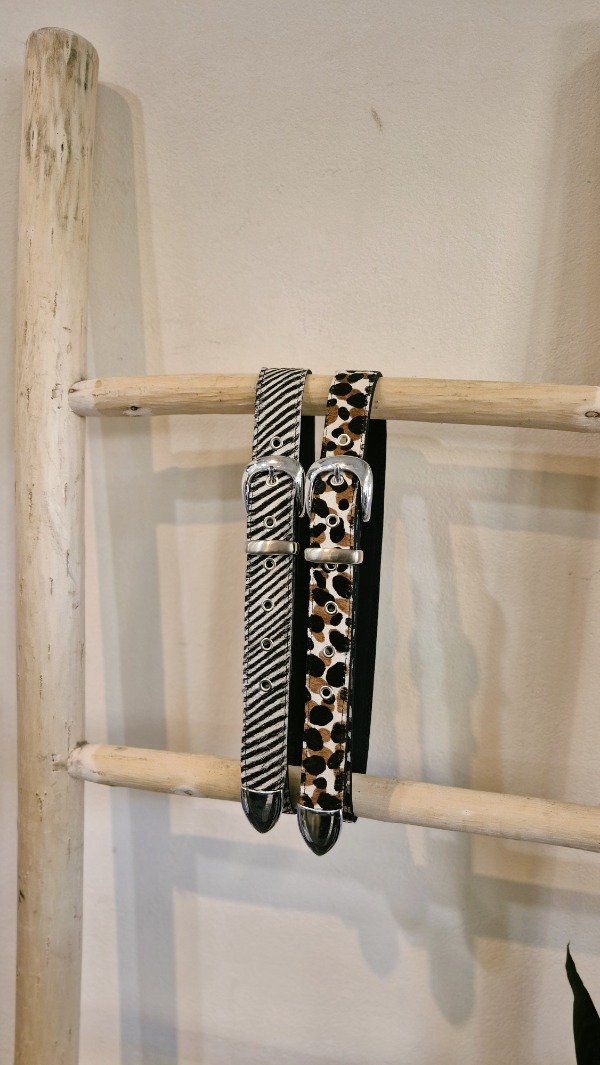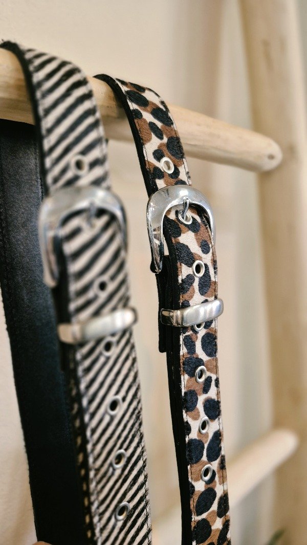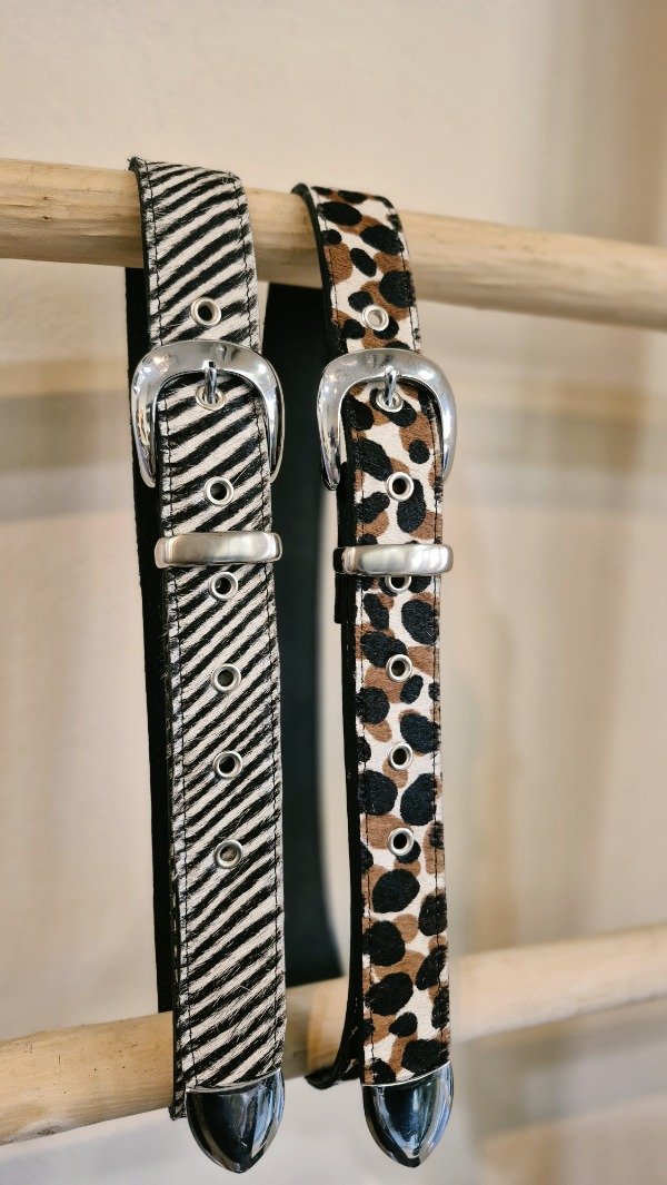 Cinto de cuero con hebilla plata con pasador y puntera. Cuero pelo print, la parte de adentro es de cuero vacuno negro