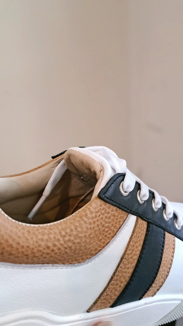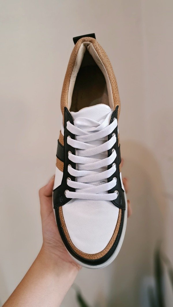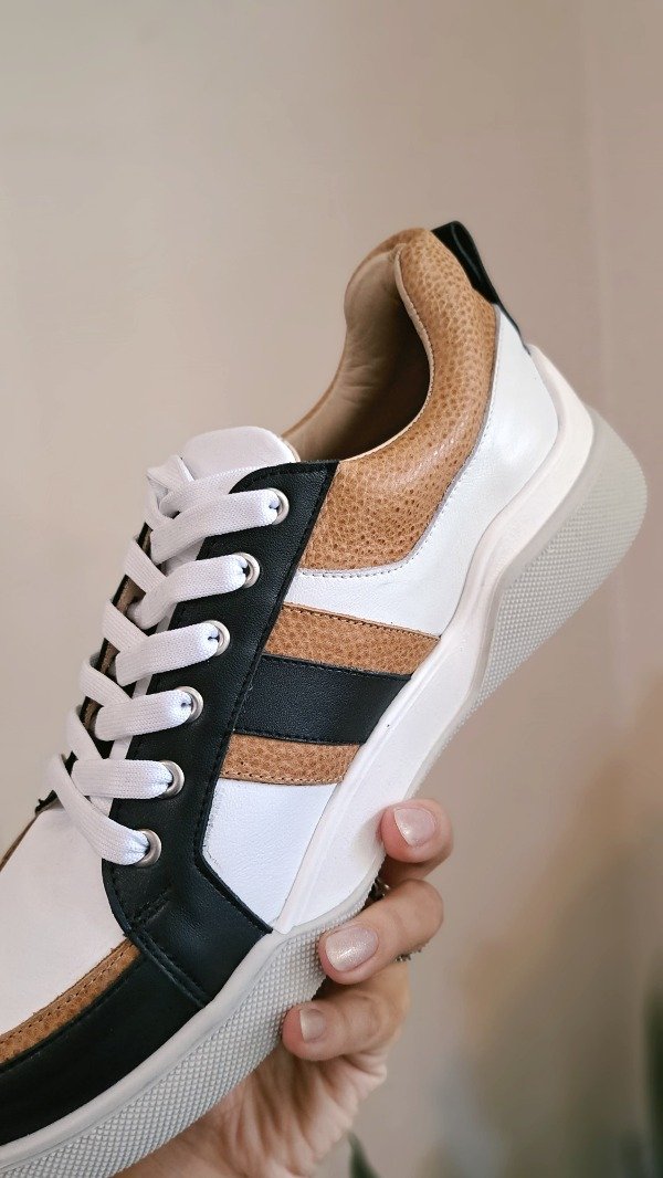 Zapatillas confeccionas 100% en cuero vacuno. Hechas de manera artesanal en Argentina. Forreria en cuero vacuno. Combinadas en tres colores de cuero, negro liso, suela y blanco.