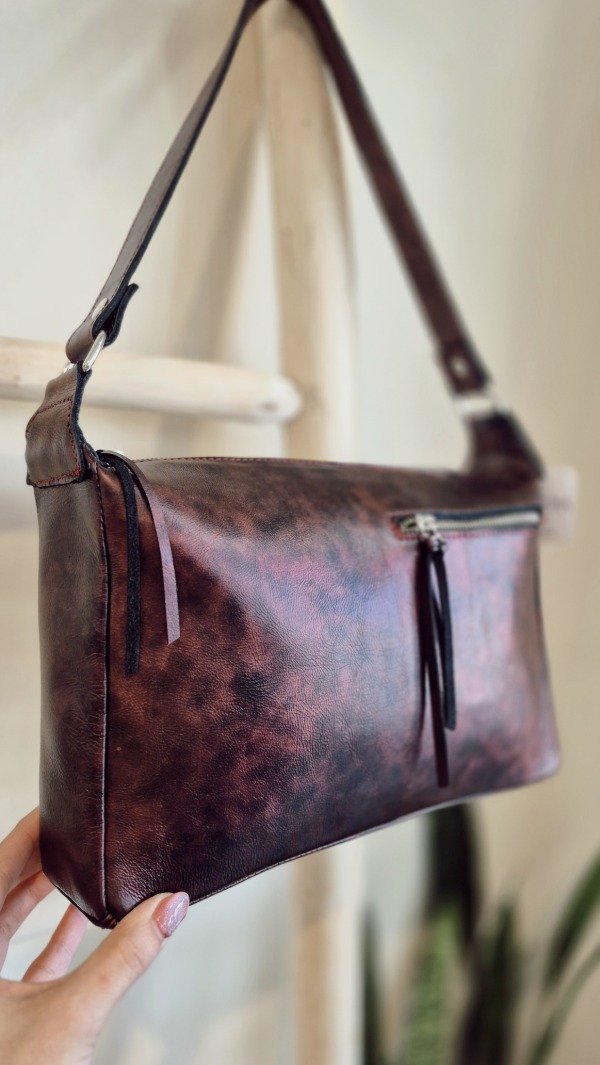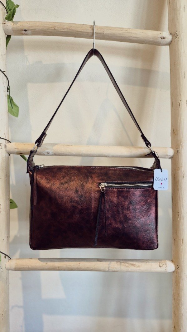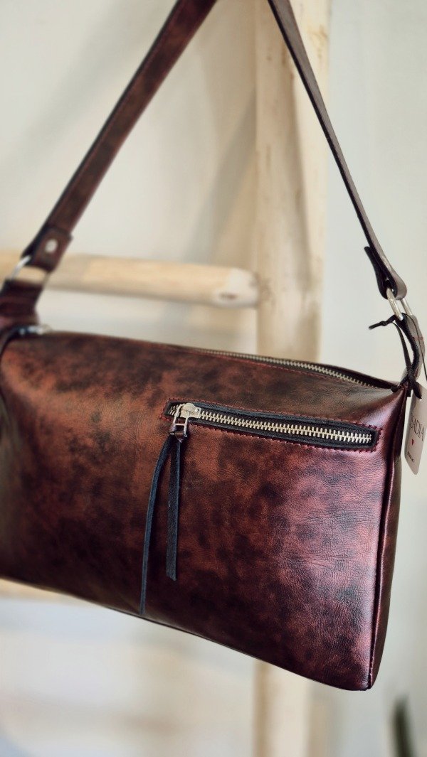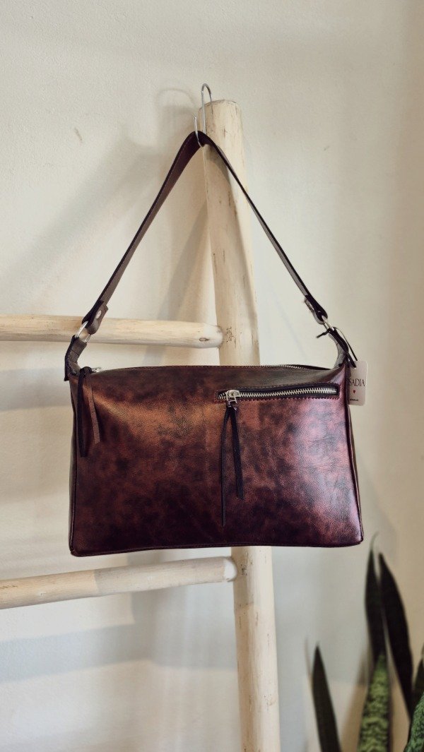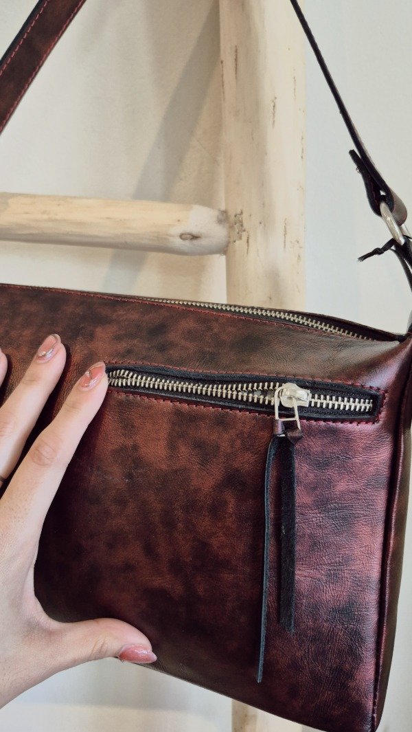 Cartera confeccionada 100% en cuero vacuno. Tipo baguette de base rectangular, con bolsillos delantero cierres metálicos YKK. Forrada interiormente con un bolsillo.