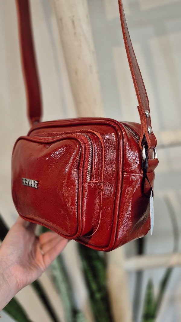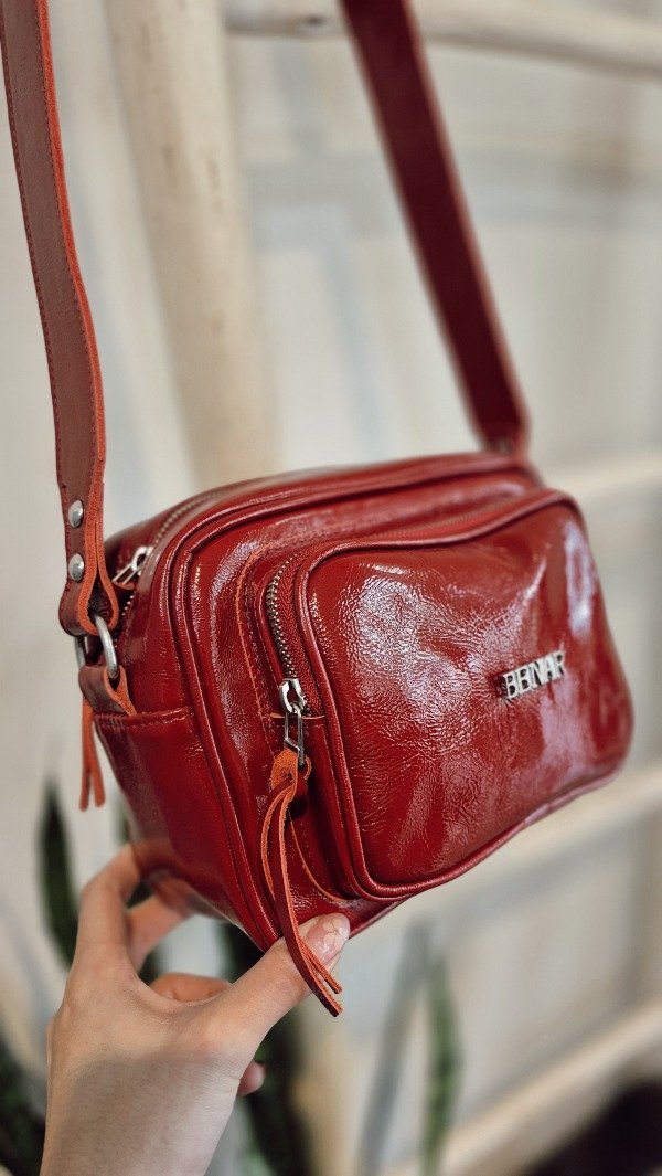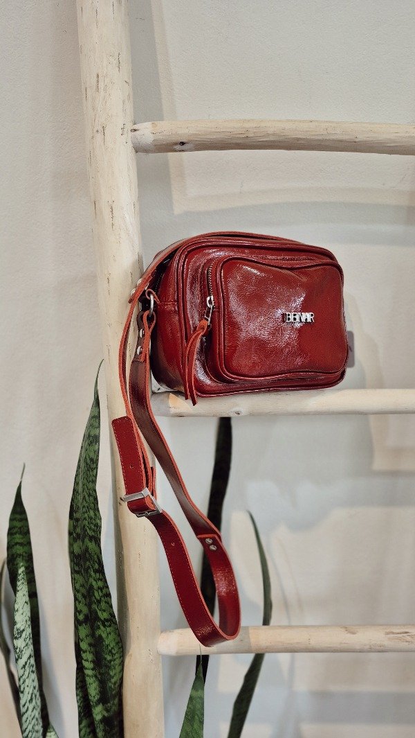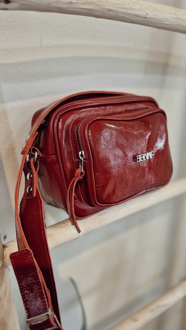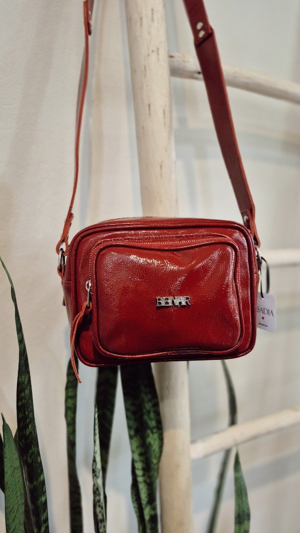 Bandolera confeccionada 100% en cuero vacuno. Con bolsillo delantero, tira regulable con hebilla. Interior forrado y envivado con bolsillo de cuero.