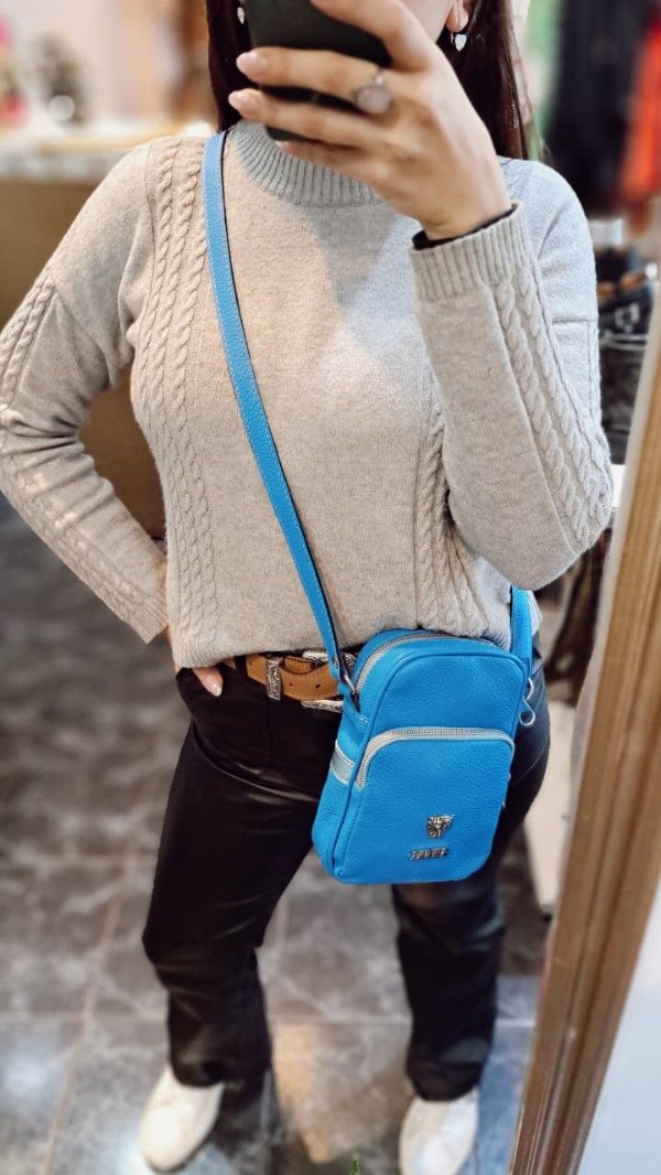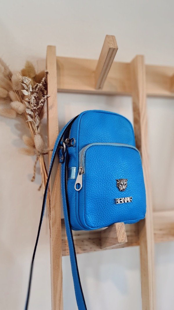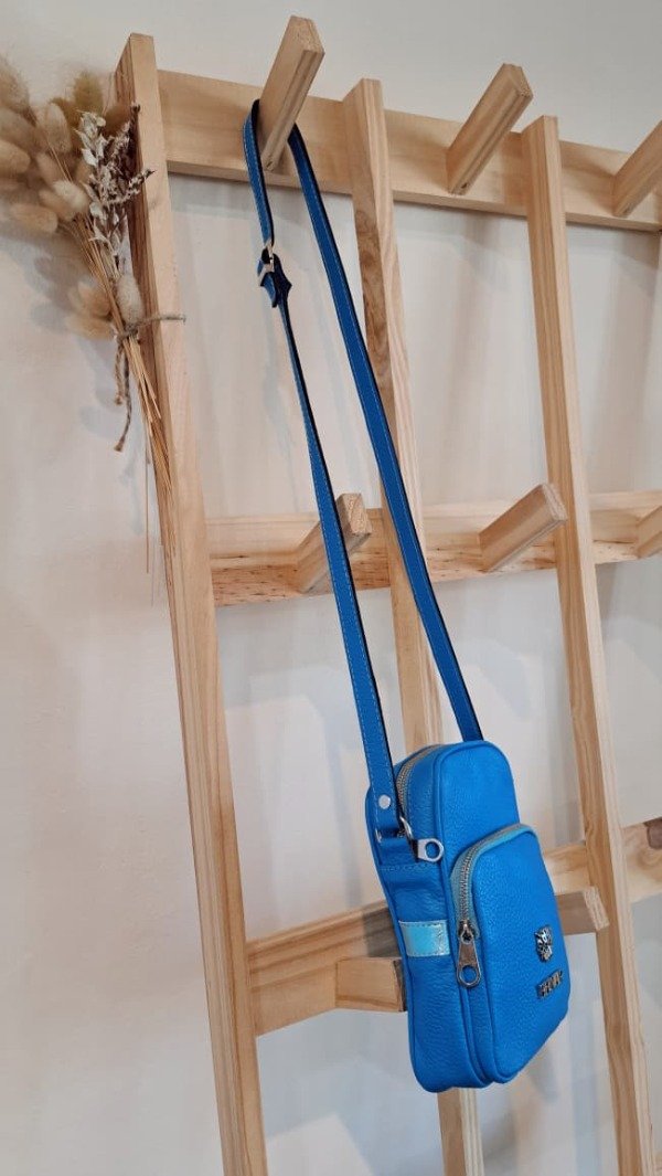 Cartera confeccionada 100% en cuero vacuno. Acceso con cierres metalicos Ykk , correa de cuero con hebilla regulable