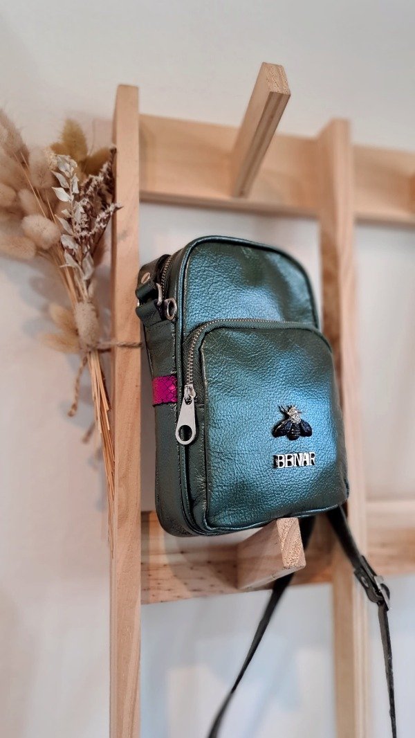 Cartera confeccionada 100% en cuero vacuno. Acceso con cierres metalicos Ykk , correa de cuero con hebilla regulable