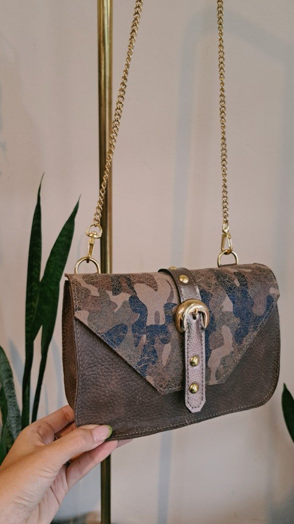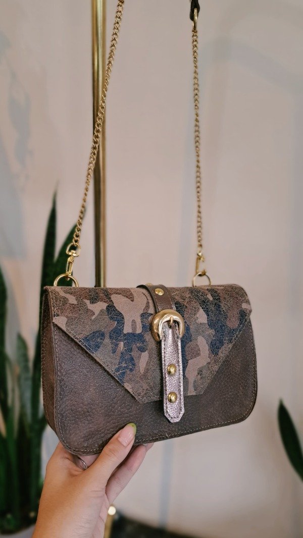 Cartera confeccionada 100% en cuero vacuno. Acceso con doble broche imán, detalle de hebilla metálica frontal, correa mitad cadera y mitad cuero. Herrajes en plateados.