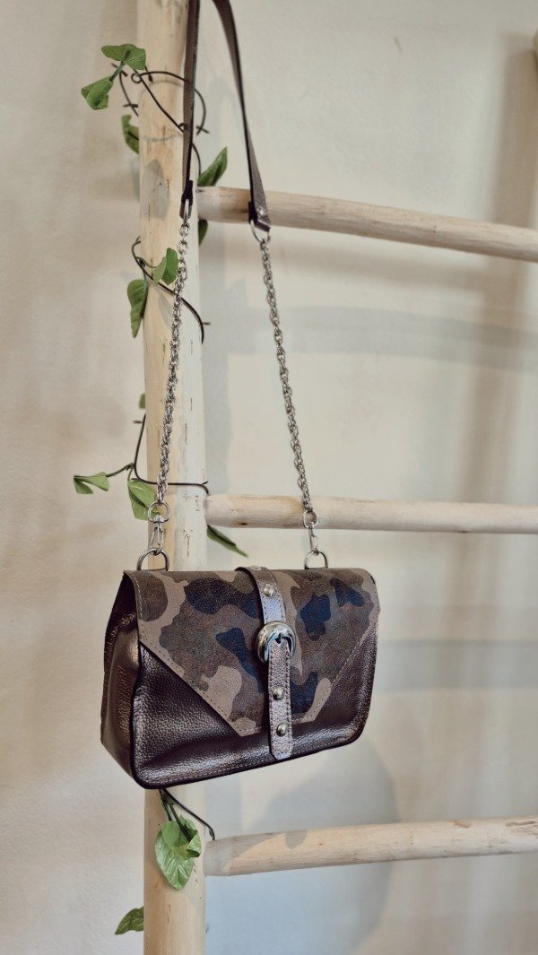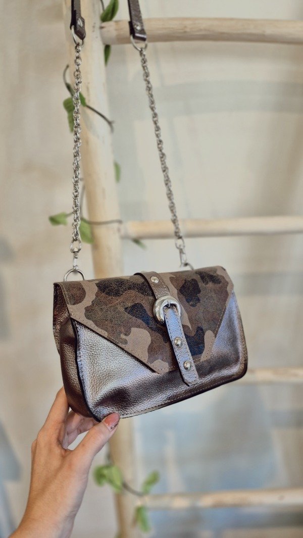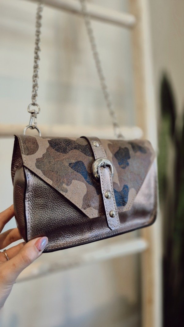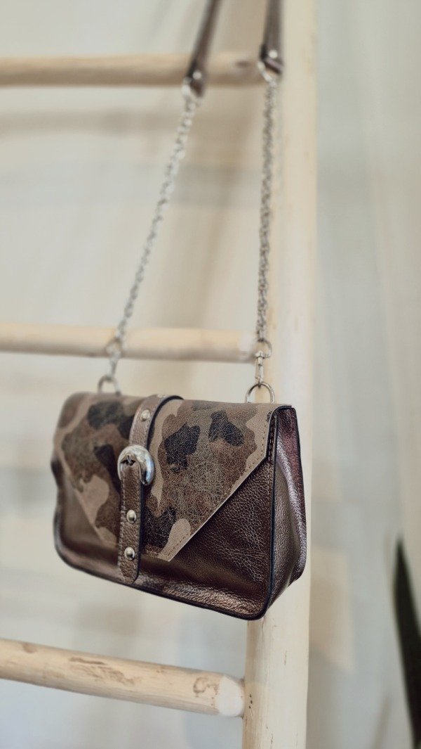Cartera confeccionada 100% en cuero vacuno. Acceso con doble broche imán, detalle de hebilla metálica frontal, correa mitad cadera y mitad cuero. Herrajes en plateados.