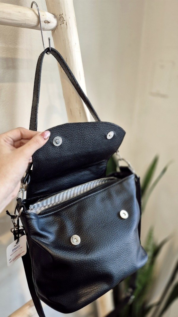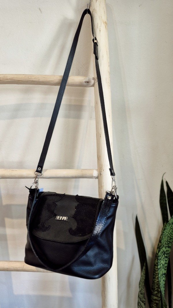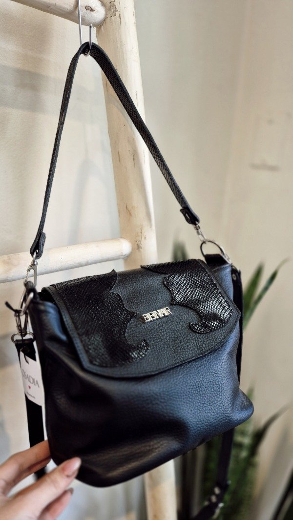 Bandolera confeccionada 100% en cuero vacuno. Con tapa con recortes. Doble tira, una corta para el hombro y otra correa larga regulable con hebilla, ambas pueden sacarse de la cartera mediante mosquetones.
