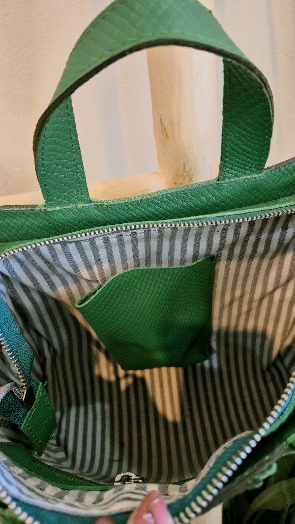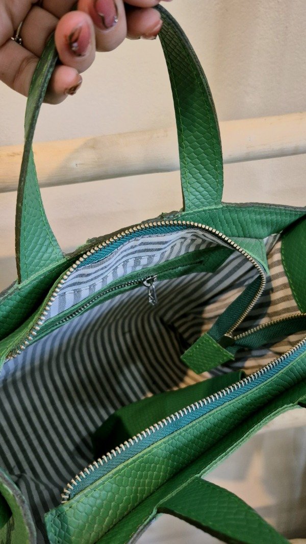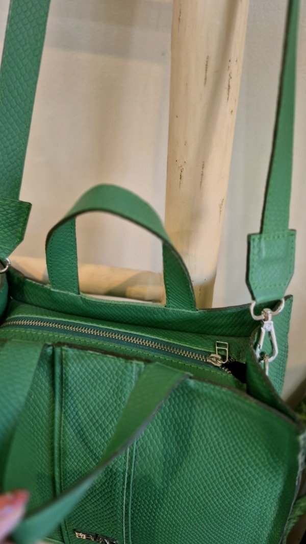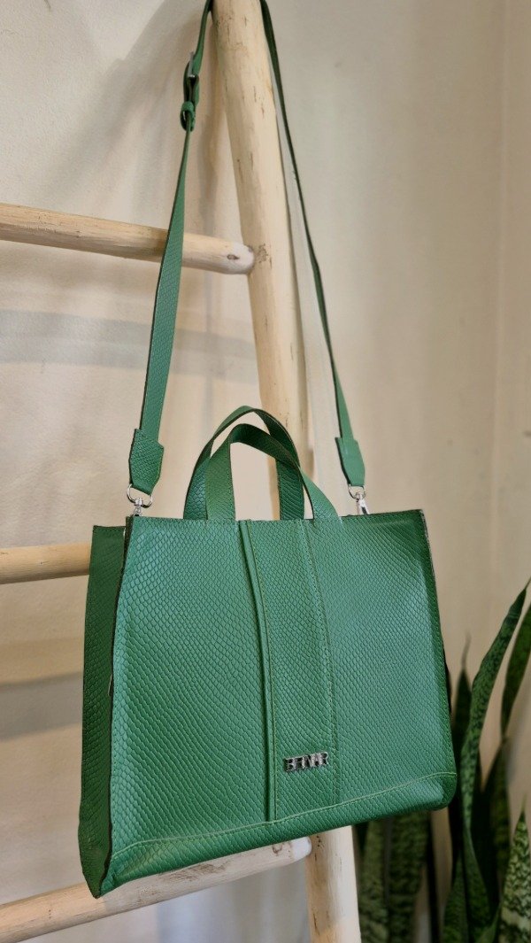 Cartera confeccionada 100% en cuero vacuno. De modelo estructurado, con manija para llevar en la mano y correa desmontable y regulable con hebilla para llevarla cruzada. Está forrada internamente, donde posee bolsillo con cierre. Acceso con cierres metálico YKK.