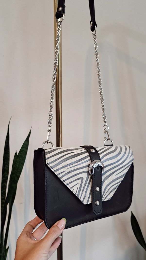 Cartera confeccionada 100% en cuero vacuno. Acceso con doble broche imán, detalle de hebilla metálica frontal, correa mitad cadera y mitad cuero.