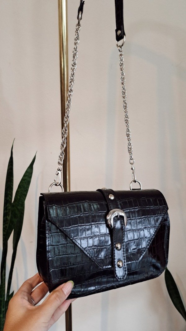 Cartera confeccionada 100% en cuero vacuno. Acceso con doble broche imán, detalle de hebilla metálica frontal, correa mitad cadera y mitad cuero.