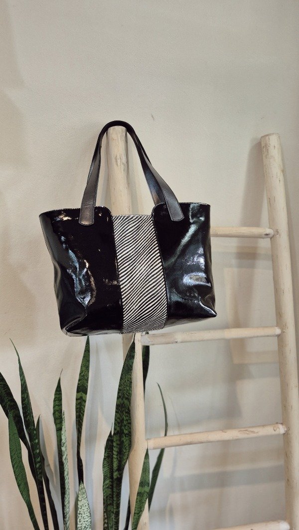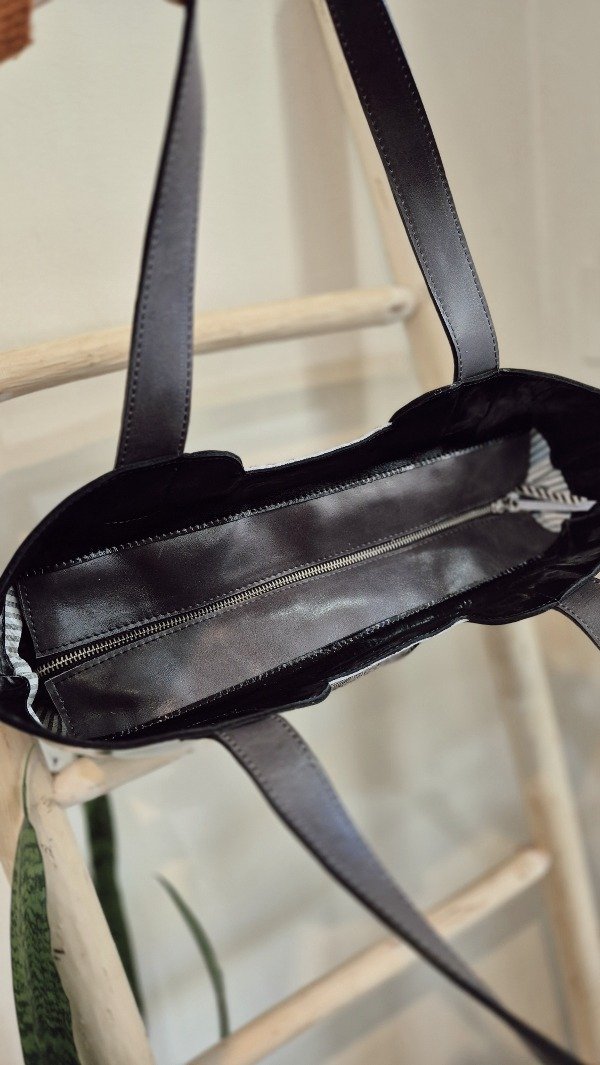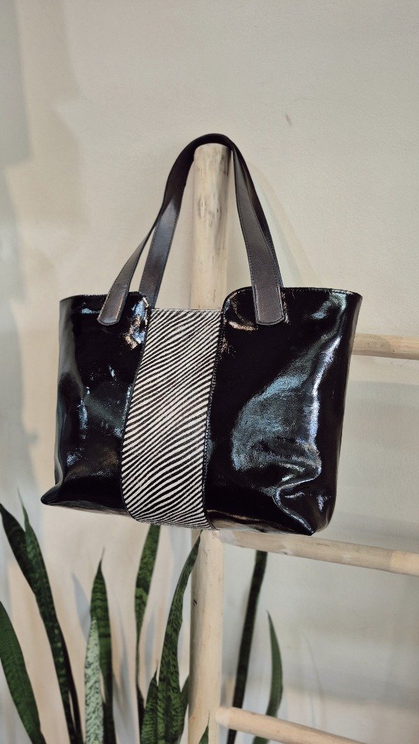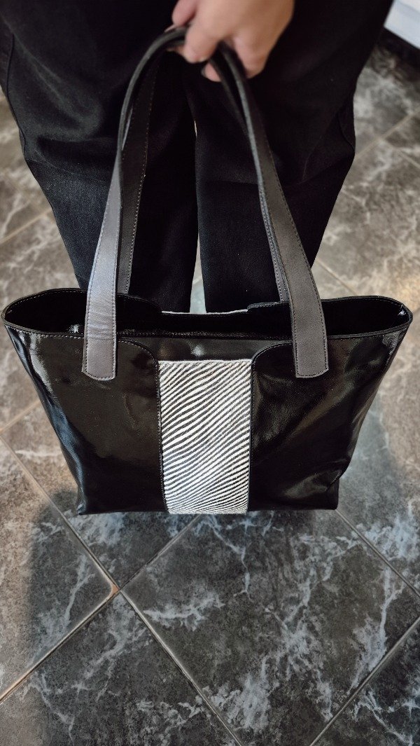 Cartera confeccionada 100% en cuero vacuno. Con recorte central en cuero pelo animal print, tira al hombro super cómoda doble cuero. Interior forrado con bolsillo con antifaz de cuero y cierre
