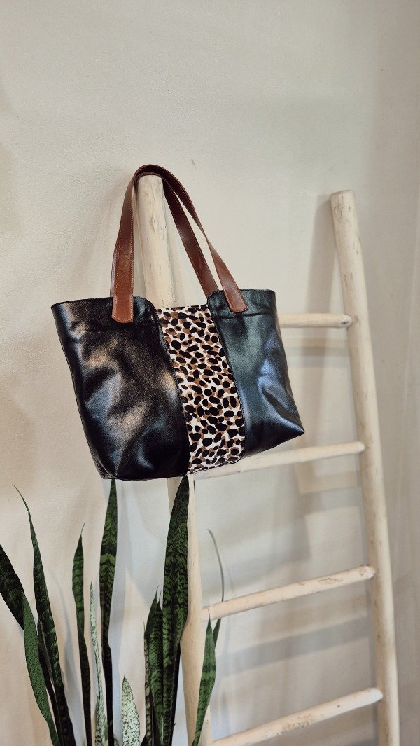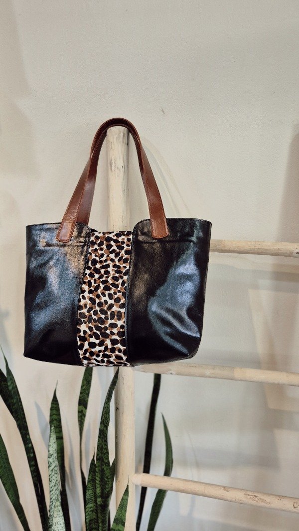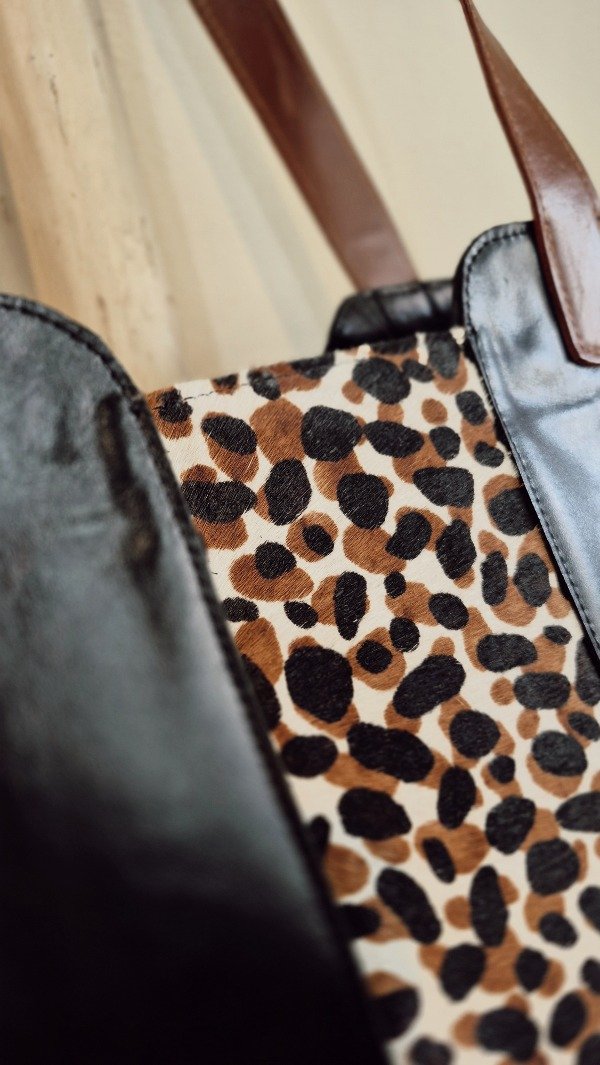 Cartera confeccionada 100% en cuero vacuno. Con recorte central en cuero pelo animal print, tira al hombro super cómoda doble cuero. Interior forrado con bolsillo con antifaz de cuero y cierre