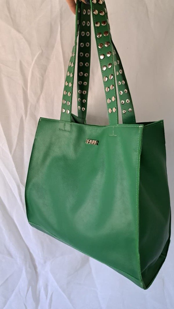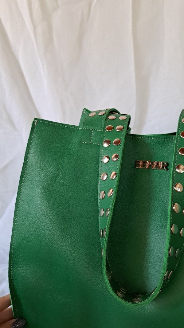 Cartera confeccionada 100% en cuero vacuno. Acceso con broche imán, base reforzada. Tiene bolsillo interno con cierre y tiras con tachas remachadas.