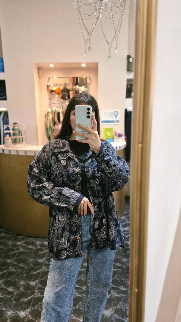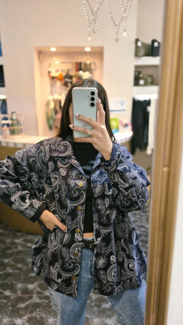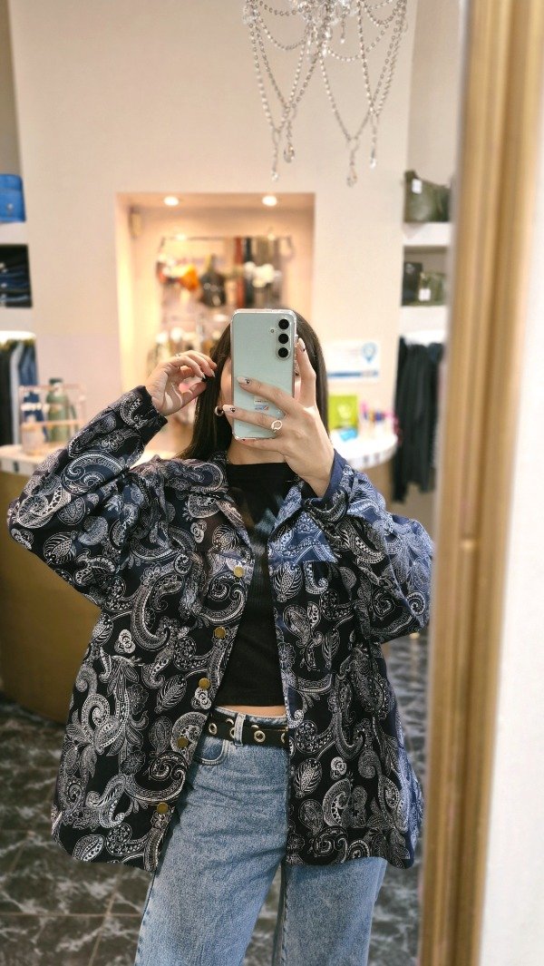 Camisaco de gabardina con estampa arabesca. De corte oversized. Es talle único pero abarca hasta el xxl