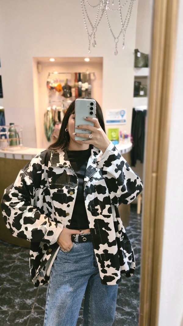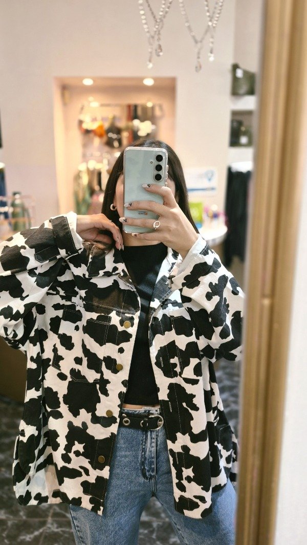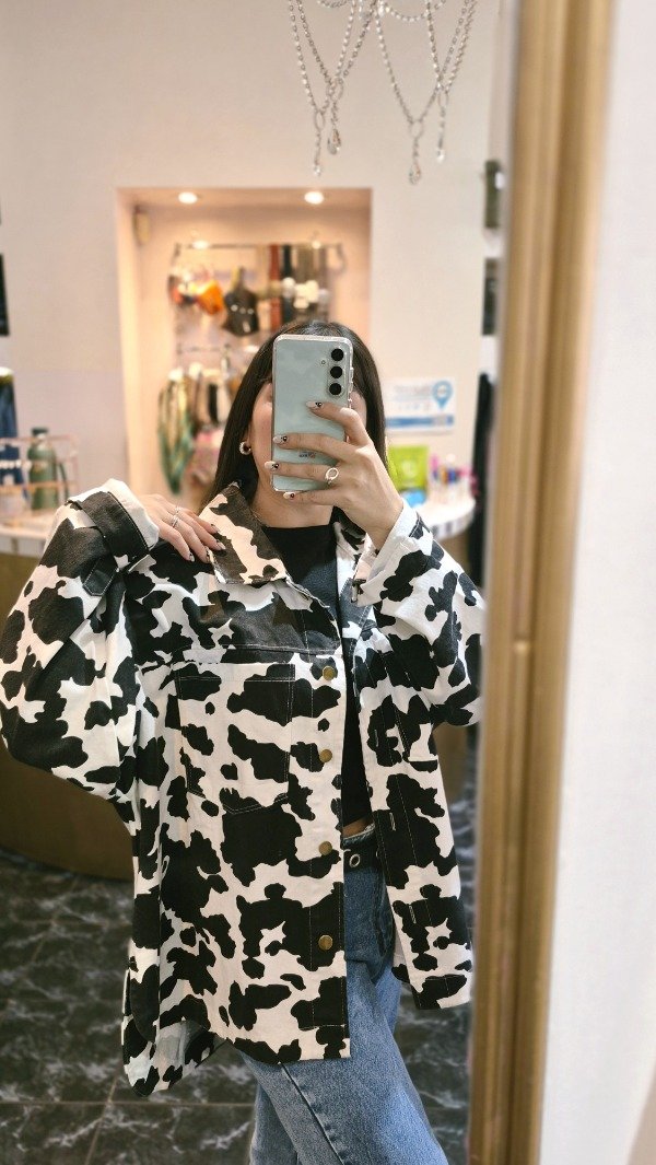 Camisaco de gabardina con estampa vaquita. De corte oversized. Es talle único pero abarca hasta el xxl