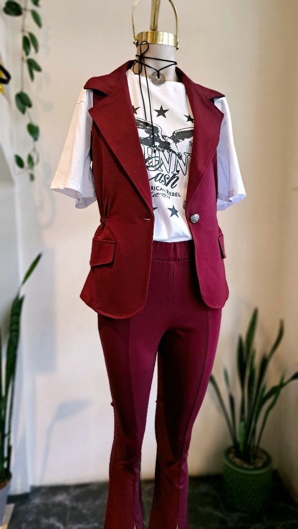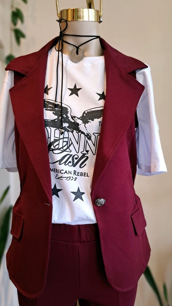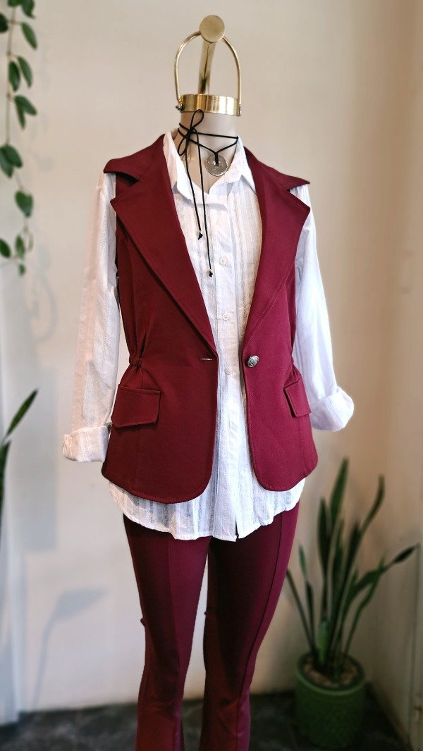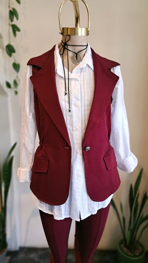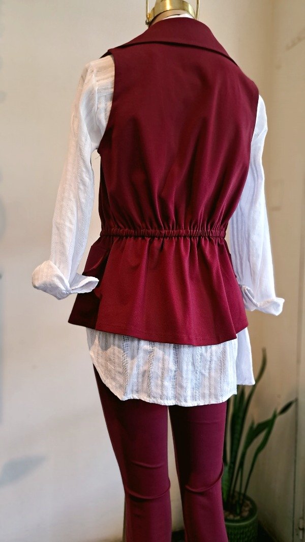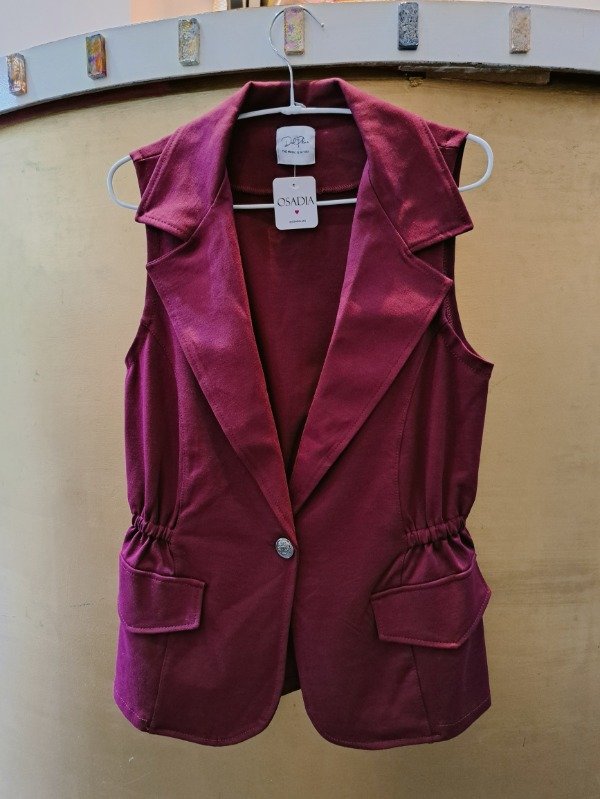 Chaleco punto roma con frunce e la cintura y tapitas delanteras.