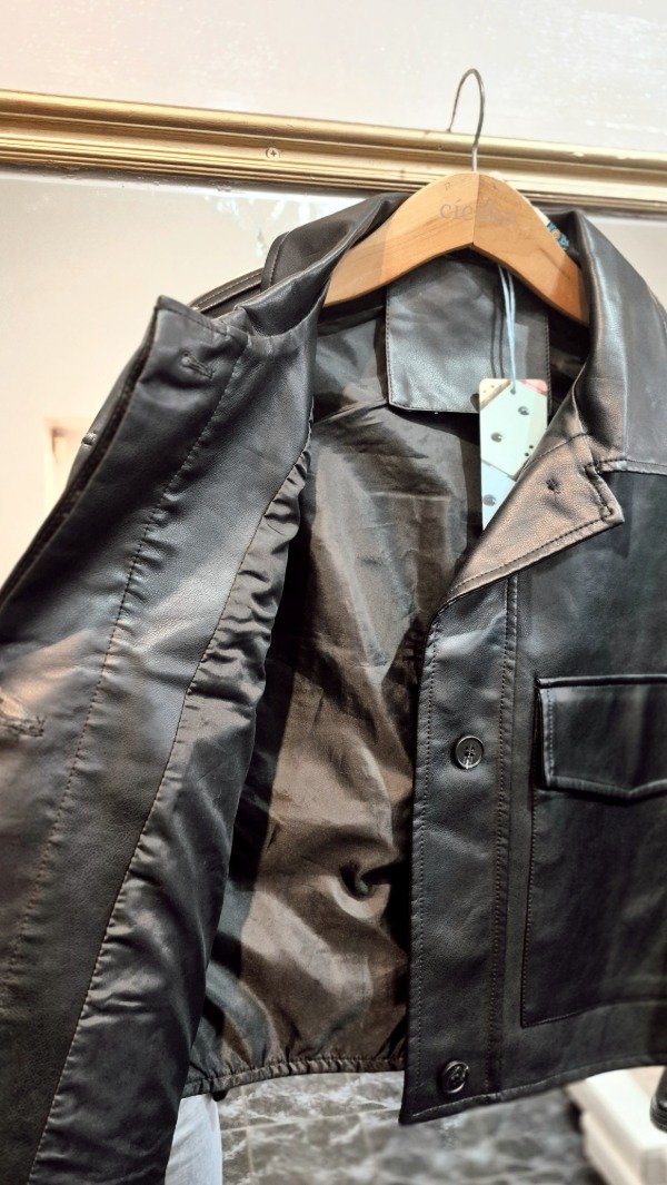 Chaqueta importado cuero sintético. De corte cuadrado, forrado internamente. Bolsillos frontales.