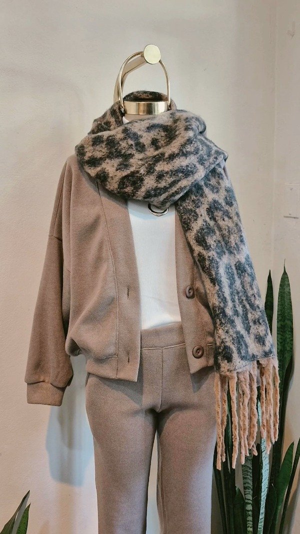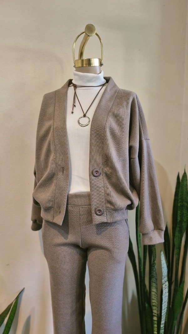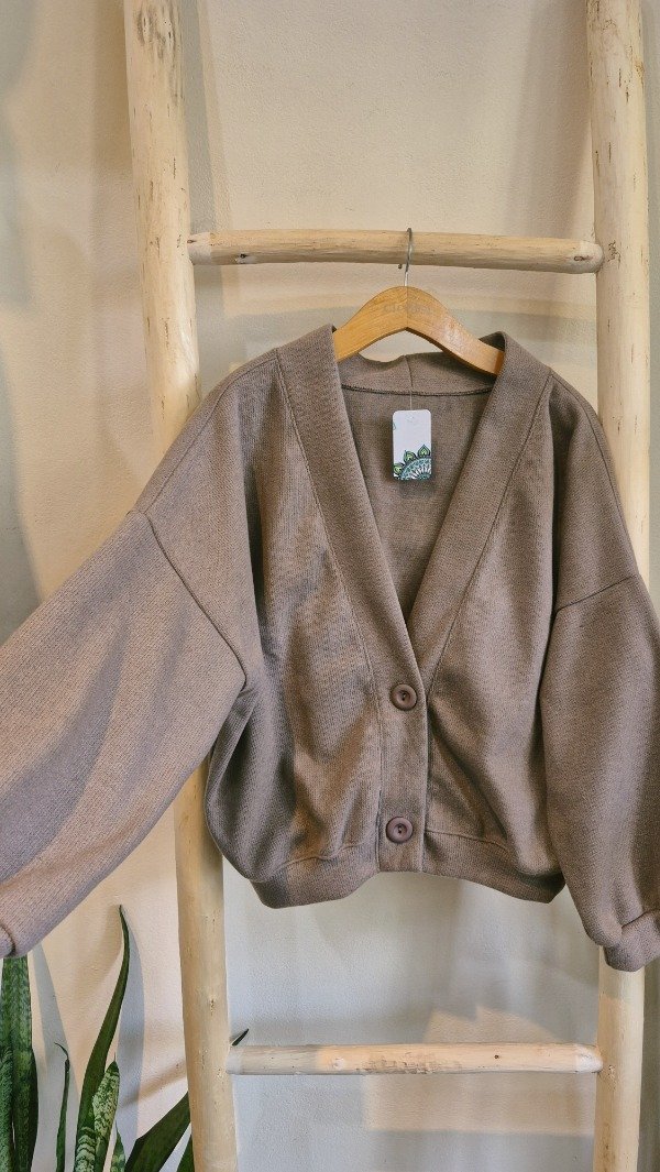 Campera/saco de tela tejida de punto tipo lanita. Es gruesa. Modelo de hombro bajo estilo oversized. Abrocha con botones