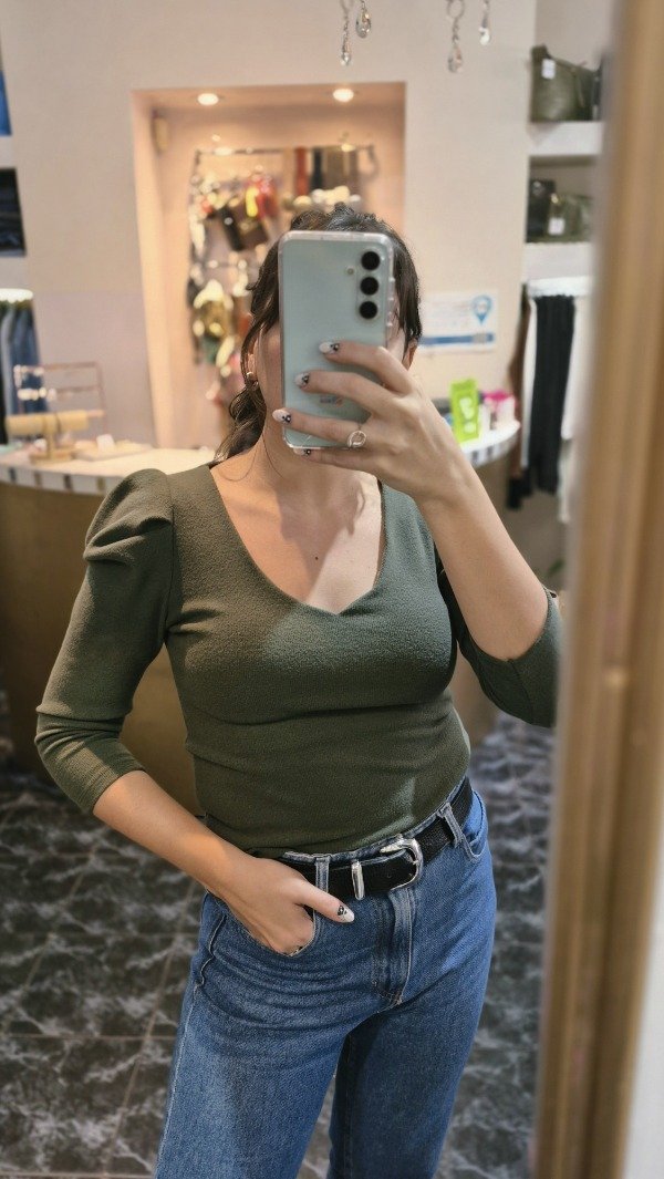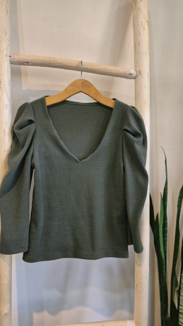 Remera mangas 3/4 con hombro estilo princesa. De tela morley de lanilla, escote v. La tela tiene elasticidad.