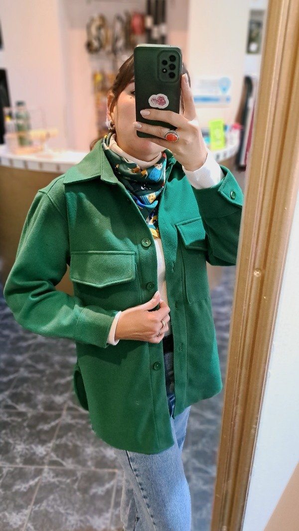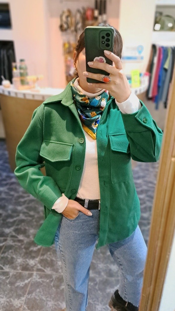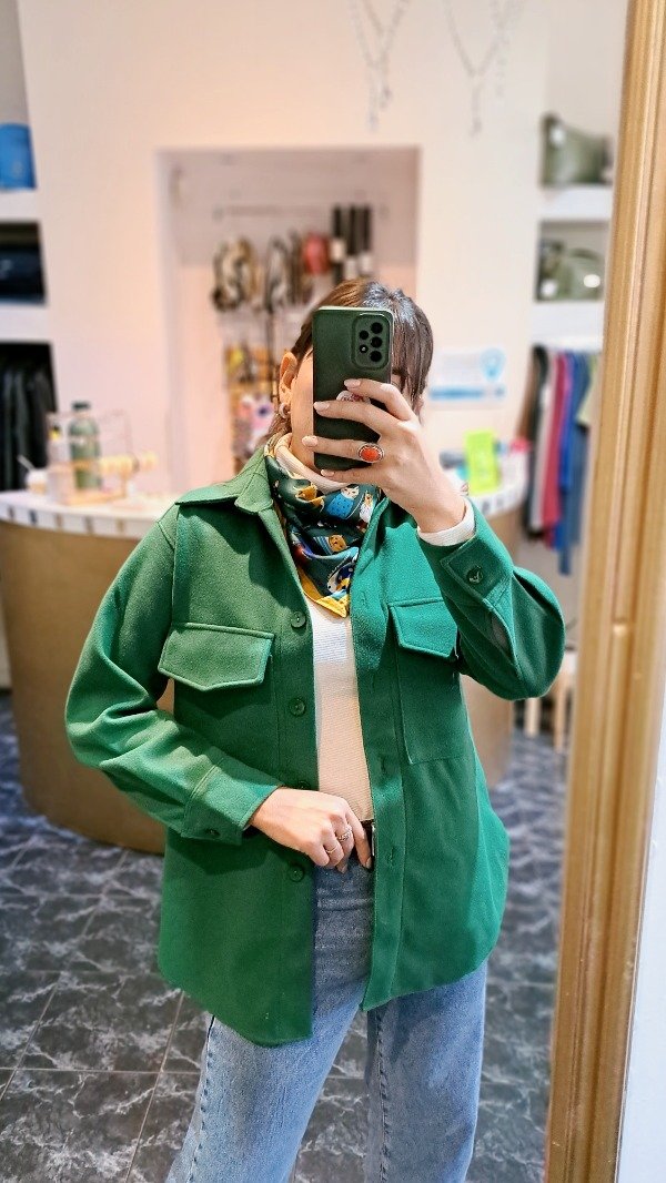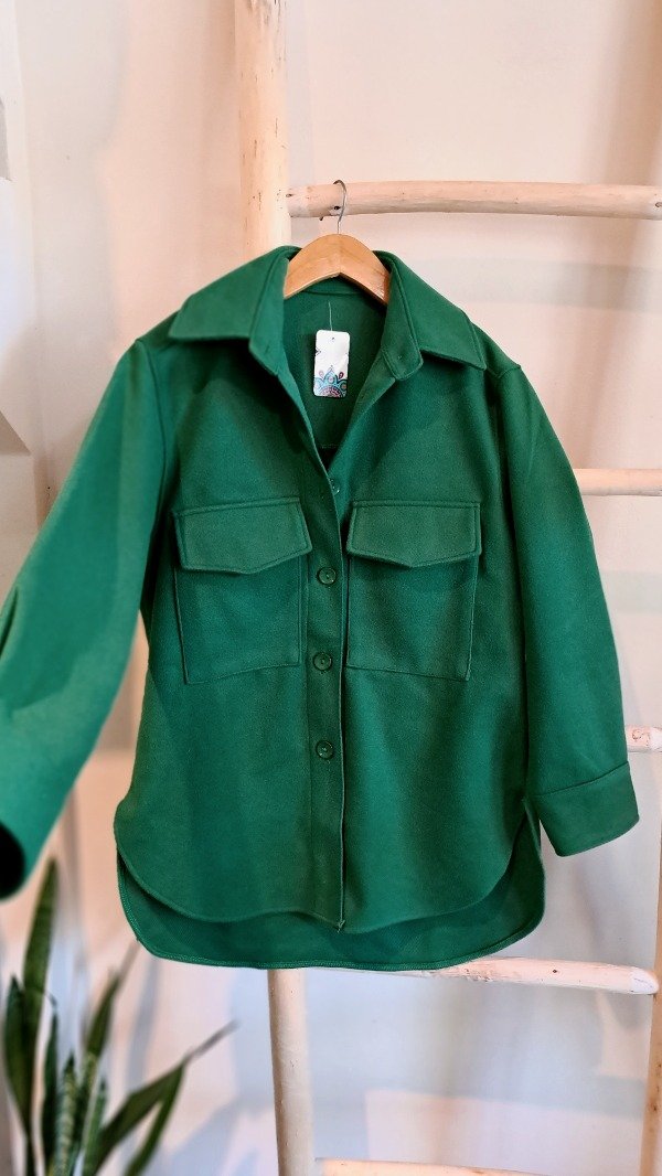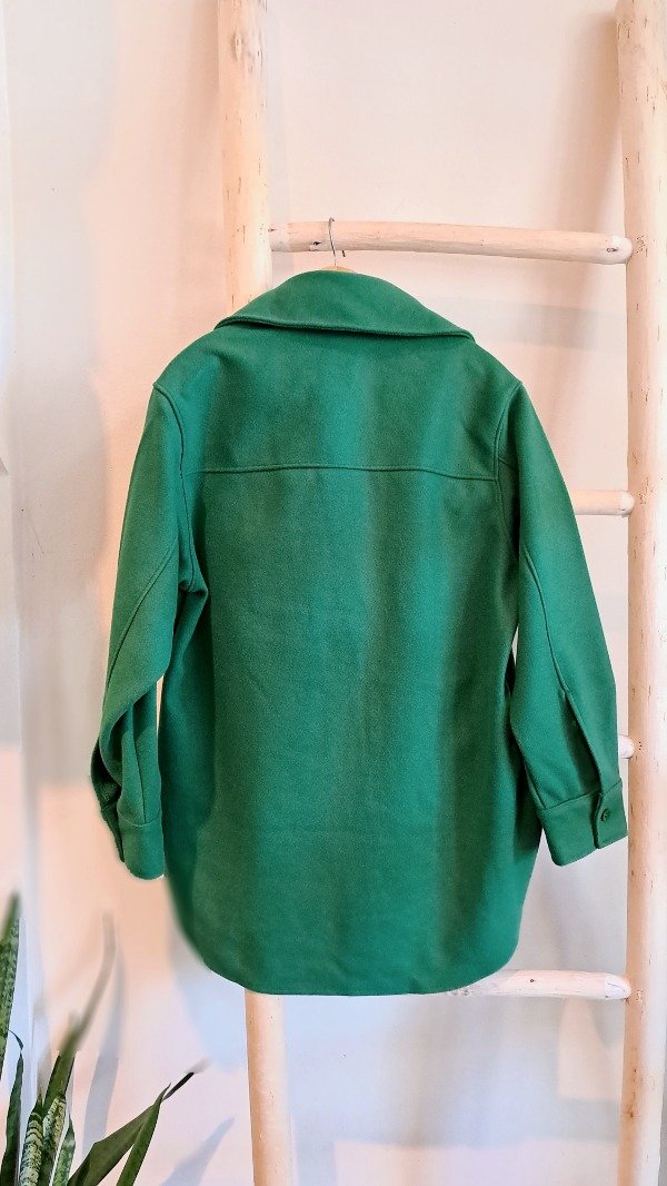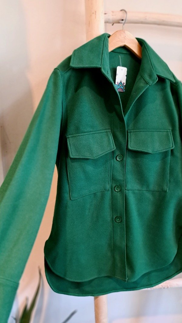 Saco de paño con bolsillos con tapita delanteros, terminación curva. Es un poco más largo atrás qué adelante.